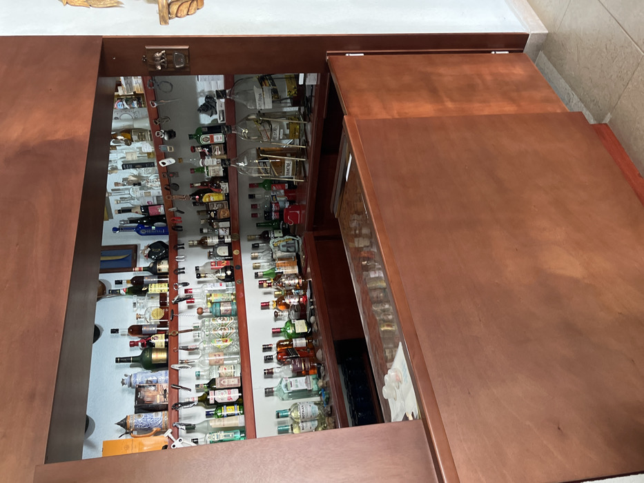 A dark wood cabinet or bar is shown with multiple shelves containing various bottles of alcohol, glassware, and accessories