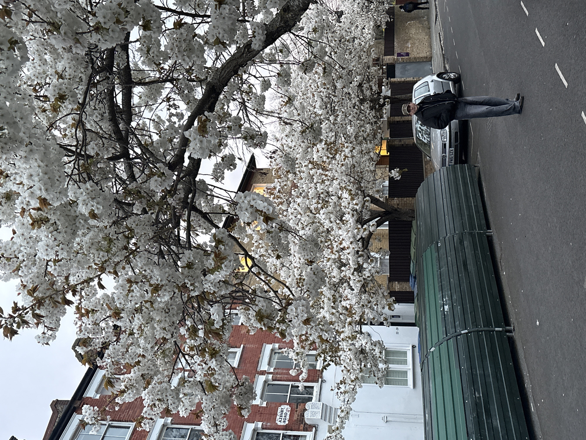 The image captures a street view on Azenby Road in London, United Kingdom, under an overcast sky. A line of large trees, heavily laden with white blossoms, extends along the street, partially obscuring the background. On the left, a multi-story residential building with red brick upper sections and white lower sections displays white-framed windows. A street sign reading "AZENBY ROAD 1886" is visible on the brickwork, and house numbers "22-28" are on the white section. Parallel to the curb on the left, a series of connected dark green, semi-cylindrical structures, likely covered storage units, are present. A silver Volkswagen Golf, license plate FN51 SZK, is parked on the right side of the asphalt street. In the foreground, a male individual stands in the middle of the street, facing slightly right, wearing a dark jacket, dark trousers, and a camouflage baseball cap, with his hands in his pockets. A second, distant individual wearing dark clothing is visible walking away on the far right sidewalk.