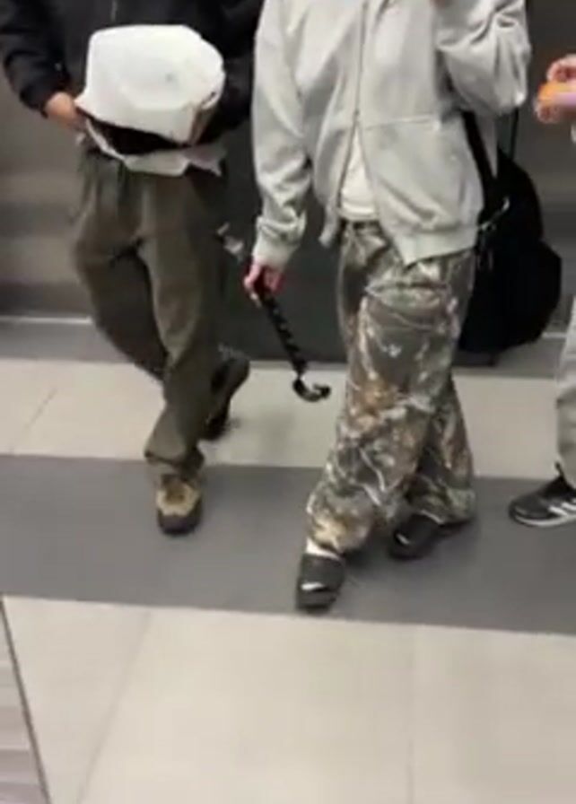 A mirror selfie taken inside an elevator reveals three individuals. On the left, a person in a dark hoodie and olive drab pants holds a white object. To the right, the selfie-taker, clad in a light gray zip-up hoodie and camouflage pants, holds a black, T-shaped object. Another person stands to their right wearing a light gray hoodie and pants. The elevator floor features a grey and white tile pattern, and the interior has brushed metal walls.