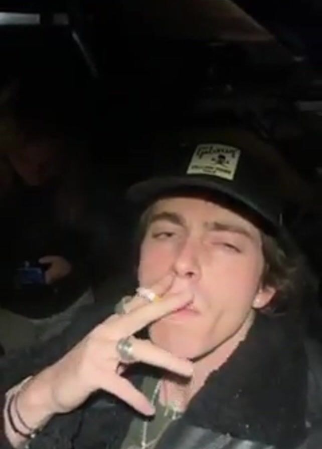 A young man is seated, wearing a black hat with a logo, a black leather jacket with a fuzzy collar, and a chain necklace. He has a cigarette in his mouth and is looking at the camera with a slight squint. A person, presumably a woman, is in the background, looking at their phone. The scene appears to be in a dimly lit or dark environment.