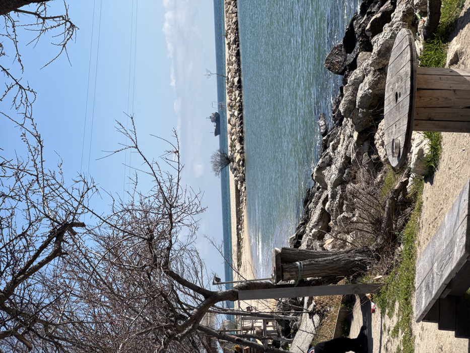 The image captures a coastal scene in Varna, Bulgaria, under clear daylight, indicative of late winter or early spring due to the bare deciduous trees. The foreground on the left features multiple leafless trees with exposed branch structures and trunks. Partially visible at the extreme lower left is the lower body, specifically the legs and feet, of an individual wearing dark footwear and trousers. Adjacent to this, a portion of a wooden structure with a thatched roof is discernible. In the foreground right, a rustic seating area is present, consisting of a wooden bench and a round table fashioned from a cable spool, upon which an ashtray rests. The ground is a mix of sand and sparse dry vegetation, with a rocky shoreline descending towards the water. The midground reveals the light blue-green waters of the Black Sea. A curved sandy beach separates the water from a prominent stone breakwater that extends into the sea, forming a small inlet or bay. A solitary, small, bare tree stands on the sandy expanse of the beach, near the breakwater. In the distant background, against a clear blue sky with minimal cloud cover, two large cargo ships or similar vessels are visible on the horizon. Overhead utility lines traverse the sky horizontally in the upper mid-ground. The scene is static, with no discernible active interactions or movement beyond the implied presence of the individual on the left.