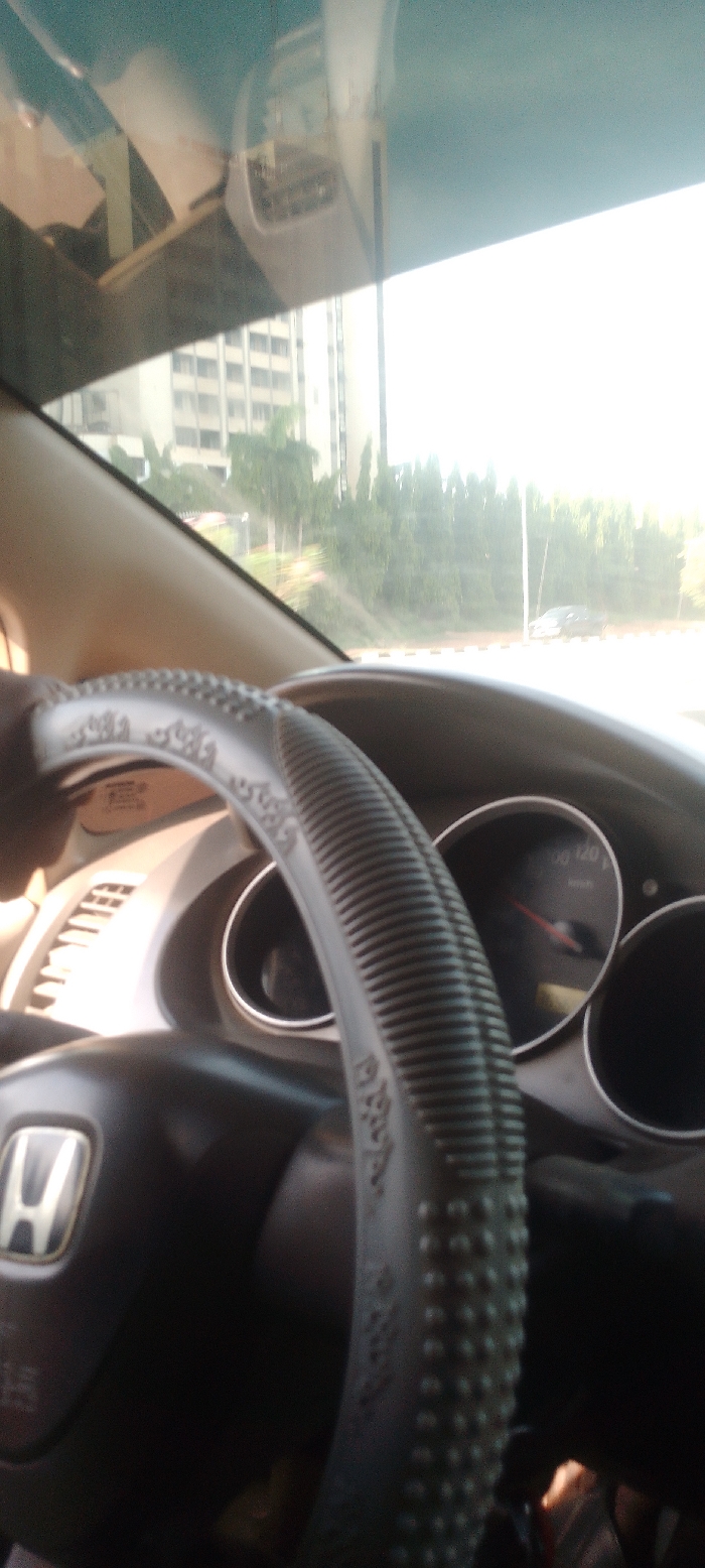 interior of a car, specifically the steering wheel and dashboard. The car is driving on a road in Aso, Nigeria. The steering wheel is black and has a Honda logo. The dashboard has a speedometer that reads 80 km/h. The windshield shows a blurred view of a road with trees and a building in the background. It is daytime, with clear, bright skies.