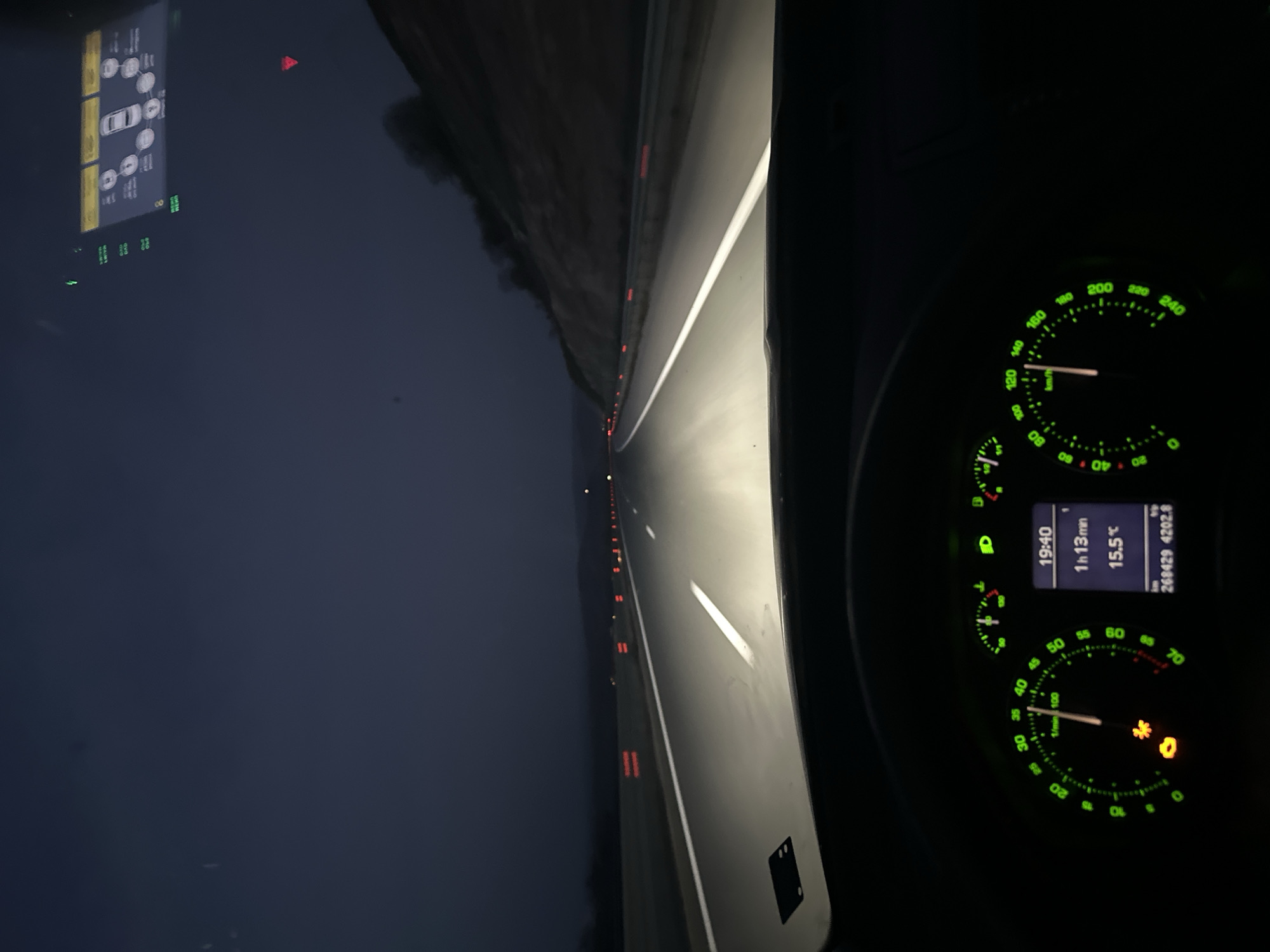 A nighttime view from inside a car, driving on a highway. The dashboard glows green, showing a speed of approximately 130 km/h. Additional gauges display time, engine revs, and temperature (15.5°C). Headlights illuminate the road ahead, marked by white lines. A head-up display projects vehicle information onto the windshield, including a radar of other vehicles. The road stretches into the distance, lined with reflectors. The sky is dark.