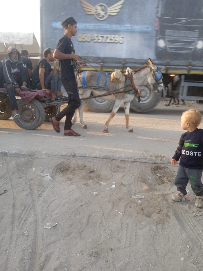 The scene is captured in Al-Mawasi, Unknown. In the foreground, a sandy, unpaved shoulder exhibits multiple tire tracks and footprints, along with scattered debris. A concrete or asphalt road surface separates the foreground from the midground. On the right side of the foreground, a young child with light-colored hair stands facing left. The child wears a dark blue long-sleeved shirt with a green Lacoste crocodile logo and white "LACOSTE" text, grey sweatpants featuring a small green crocodile logo on the left thigh, and light-colored shoes. In the midground, a light-colored donkey, fitted with a harness, blue straps, and a small tan pack on its back, pulls a two-wheeled, dark-colored wooden cart equipped with rubber tires. The donkey's muzzle area is partially covered with blue material. A young male, possibly a teenager, walks to the left of the donkey, holding its reins. He wears a black t-shirt, dark pants, brown sandals, and a dark cap. Three adult males are seated in the cart. The leftmost male, possibly elderly, has a beard and wears a dark hoodie, dark pants, and light-colored slides. The two other males are partially obscured; one wears a black t-shirt. In the background, a large grey semi-truck with a black cab is in motion, partially visible on the right. The truck's side displays a gold winged emblem and the text "050-5572596". A blurred human figure is visible near the truck's wheels on the right. A light-colored tent or temporary structure is partially visible on the far left background.