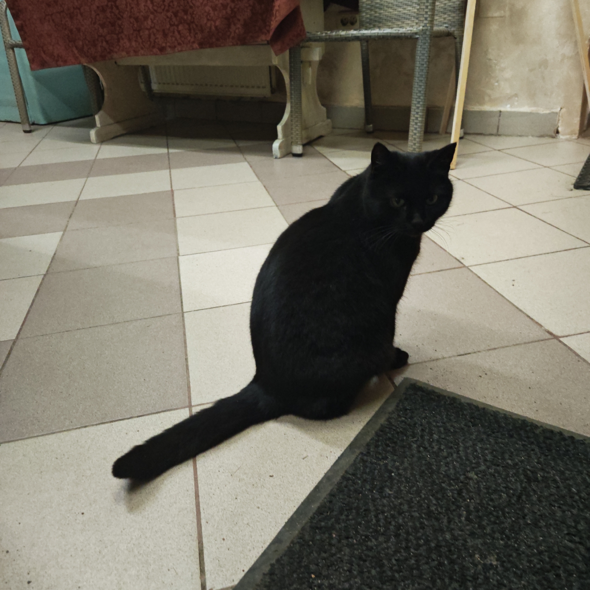 A black cat sits on a tiled floor in what appears to be an indoor space. The floor tiles are arranged in a checkered pattern of light gray and off-white. A dark gray doormat sits to the lower right of the cat. In the background, there is a light-colored wall and some furniture, including a table with a reddish-brown tablecloth and a wicker chair. The location is not determinable as Kladovitsy, Russia from the provided image.