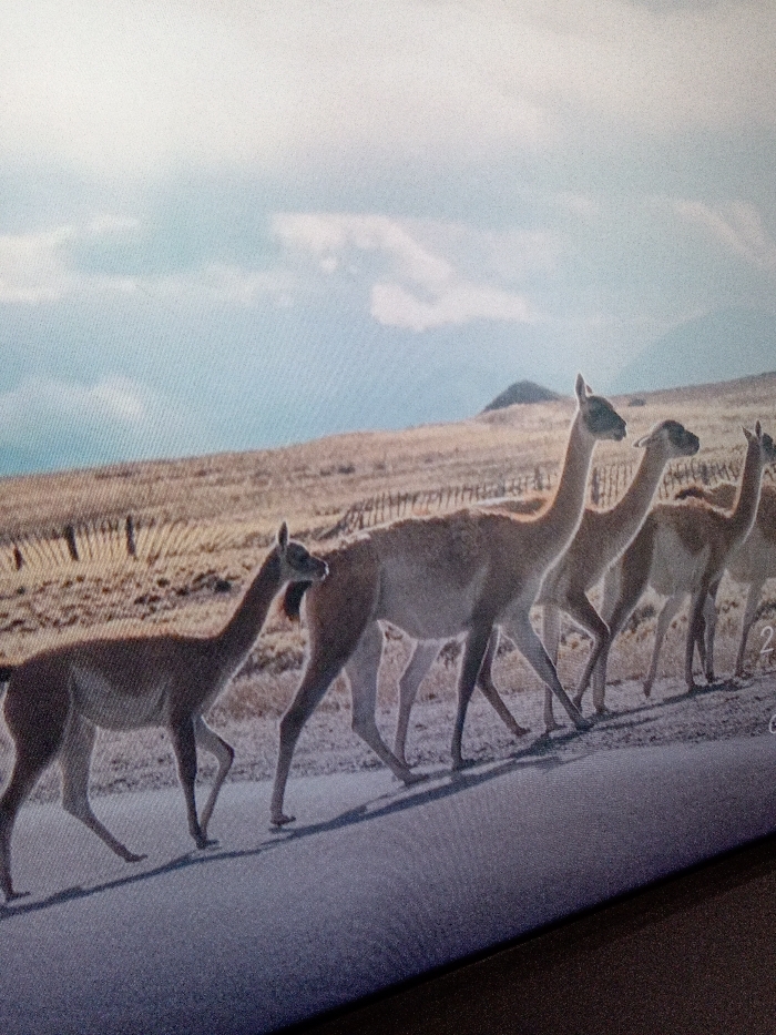 - "The image depicts five guanacos walking in a single file line from left to right on a paved road" by FM-FBtc13, licensed under CC BY 4.0