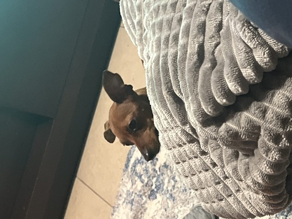 - "A brown dog with floppy ears peeks out from behind a gray, textured, plush blanket" by FM-z4cUR2, licensed under CC BY 4.0
