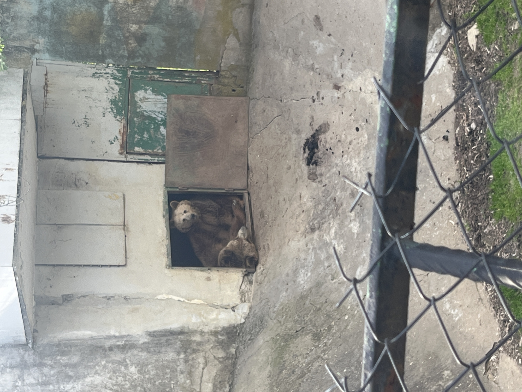 A medium-shot photograph shows two brown bears partially inside a small opening of a concrete structure