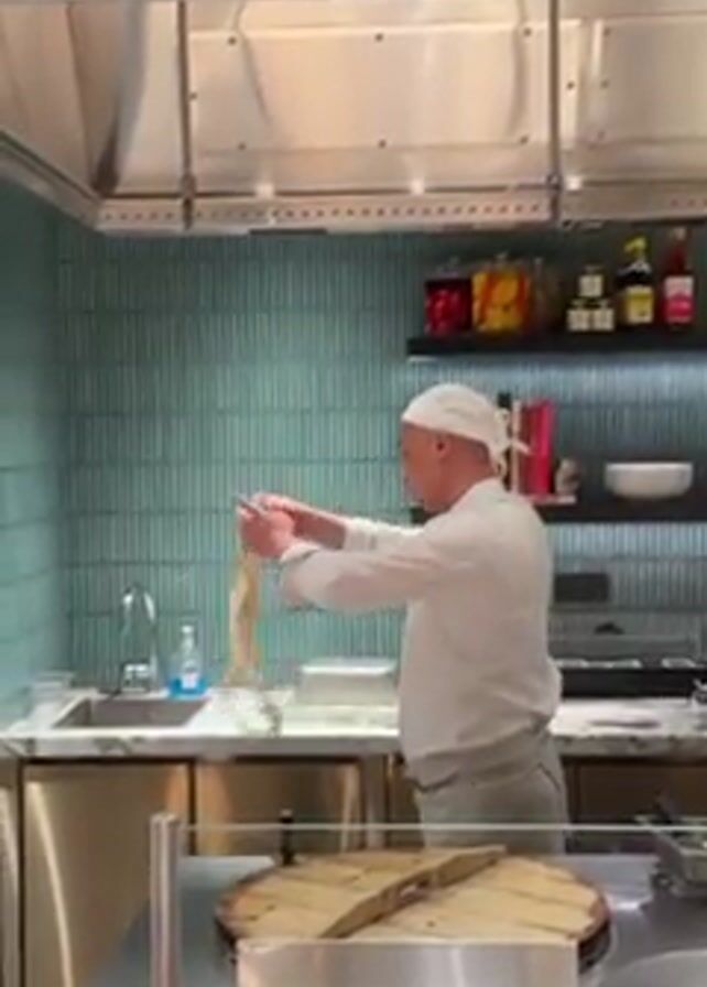In a well-lit, modern kitchen, a chef is preparing noodles