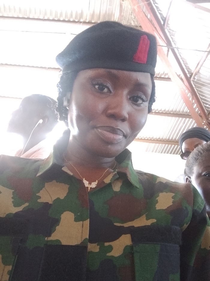 A female individual is centrally featured in a close-up, likely self-taken, portrait photograph. She has dark skin, an oval face, and a slight smile. She wears a black beret with a red rectangular flash on the right side. Her uniform is a green, brown, and black camouflage shirt with two black rectangular patches on the chest pockets. A gold-colored necklace with a winged, possibly gem-encrusted, pendant is visible around her neck. In the blurry background, to the left, another individual is partially visible from behind, appearing to wear an earbud, heavily backlit. To the right, parts of two other individuals are discernible, one wearing a dark head covering. The setting features an overhead corrugated metal roof structure with visible support beams, indicating an indoor or covered outdoor area. The location is in Kaninkon, Nigeria.