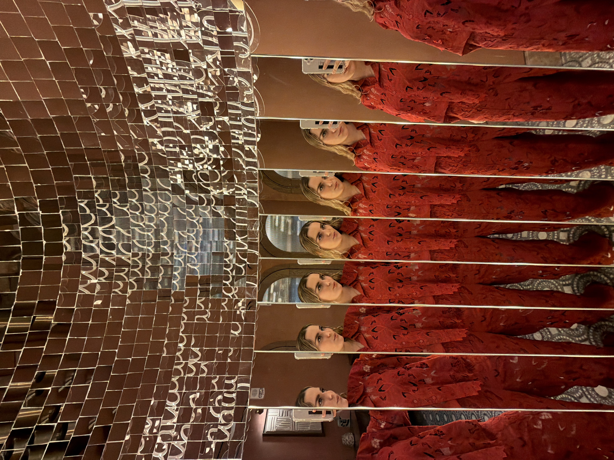 The image presents a woman in a red outfit, seemingly taking a selfie in front of a wall or structure covered in small, reflective tiles. The tiles create multiple reflections of her, arranged horizontally. The environment appears to be indoors, with warm-toned walls and a glimpse of an ornate ceiling in the reflections. The scene includes a mobile phone being held by the woman in some of the reflections. The location in Miami, United States of America cannot be determined from the image.