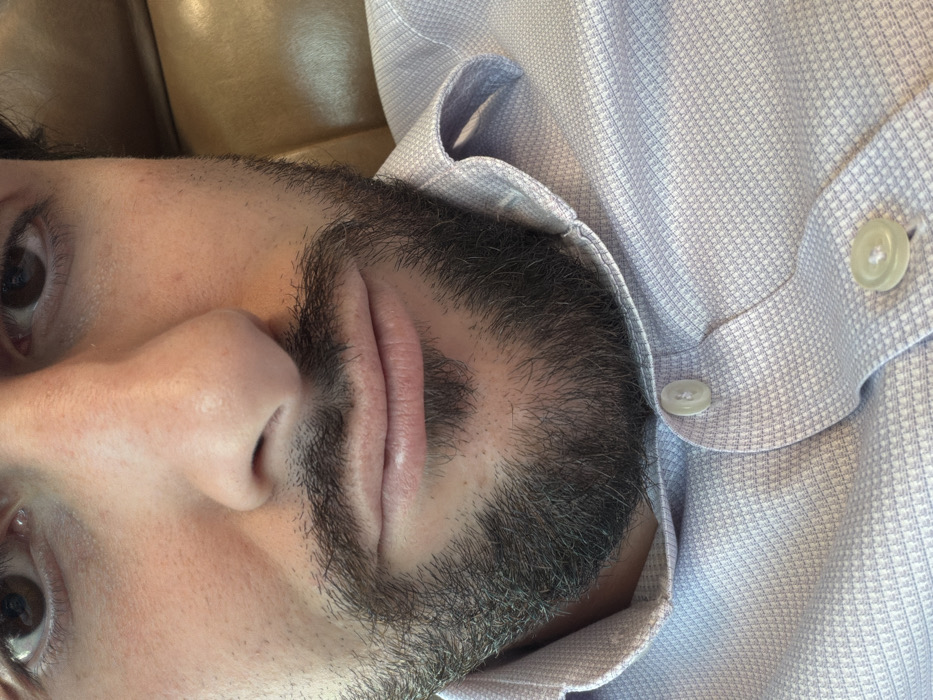 The scene depicts a close-up, upward-angled shot of an adult male subject, taken in Las Condes, Chile. The individual possesses brown eyes, a prominent nose, and full lips. A dark, medium-length beard covers his chin and jawline. He is wearing a light-colored dress shirt, possibly light blue or lavender, with a textured weave pattern; the top two buttons are unfastened. To the right and behind the subject, a blurred, tan or light brown surface consistent with leather upholstery is visible, suggesting an indoor setting and the subject is seated. The subject's expression is neutral, with a slight upward curve to the lips. No explicit actions or interactions are visible beyond the implied act of being photographed or taking a selfie.