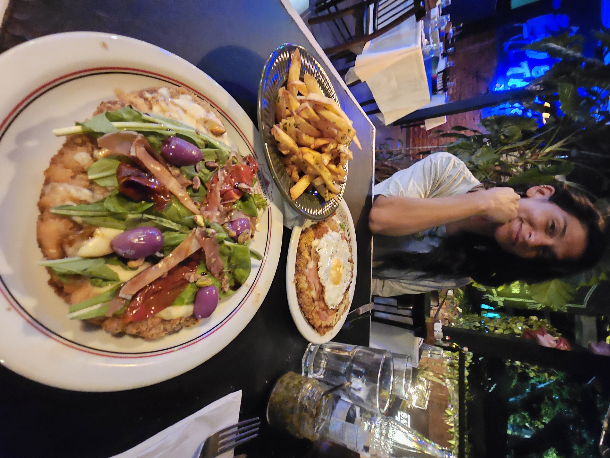 Here is a detailed description of the image: The image is taken at what appears to be an outdoor restaurant in Armação Dos Búzios, Brazil. The setting suggests a casual dining experience. In the foreground, a table is laden with food. A large white plate holds what looks like a Milanesa topped with fresh arugula, prosciutto, olives, and perhaps some cheese. Alongside it is a silver basket piled high with golden french fries. A smaller dish with a fried egg on top of a meat and potato dish is also visible. In the center of the frame, several empty drinking glasses and a bottle are clustered together. Silverware is partially visible near the bottom edge of the image. To the right of the table, a woman is visible, her cheek resting on her hand. She appears to be relaxed and content, perhaps enjoying the atmosphere. Behind her, there is foliage and what looks like exterior lighting or a cityscape. The environment is vibrant, with greenery suggesting a garden or outdoor seating area. The composition and details suggest a casual meal enjoyed at a restaurant in a resort town.