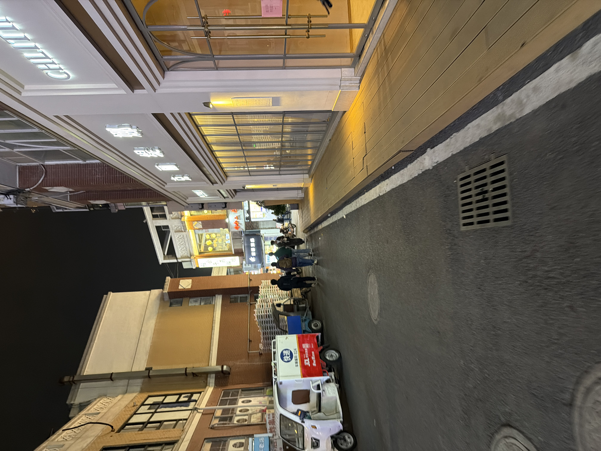The image displays a nighttime street scene in Jiangning District, China. The view is from street level, looking forward down a narrow urban road. The asphalt roadway is marked with a white painted line along its right edge and features two circular manhole covers and a rectangular metal drainage grate. On the left side, buildings with a mix of architectural styles are present. The closest building exhibits a brick base, light-colored stucco upper sections, and multiple rectangular windows, some fitted with external air conditioning units. A prominent metal drainage pipe runs vertically along its facade. Further down the street, additional buildings are visible, some displaying illuminated Chinese signage. On the right side, a modern commercial building occupies the foreground, featuring a white facade and large, multi-paned glass windows. Illuminated signage includes partial English text "CHILI" and Chinese characters. A wooden boardwalk or platform extends along the front of this building. A red notice or sign is affixed to the glass entry door. Approximately six to eight individuals, appearing to be adults, are walking in the middle ground of the street. They are dressed in casual attire. Several vehicles are present on the left side of the street. Closest to the viewer is a white electric tricycle delivery vehicle, marked with "快递" (Express Delivery), "JD.com," and the fleet number "车队车024." Immediately behind it, a blue electric tricycle carries a tall stack of what appear to be empty plastic crates or trays. Another tricycle is partially visible behind the blue unit. A motorcycle or scooter is parked further down the street on the right side.