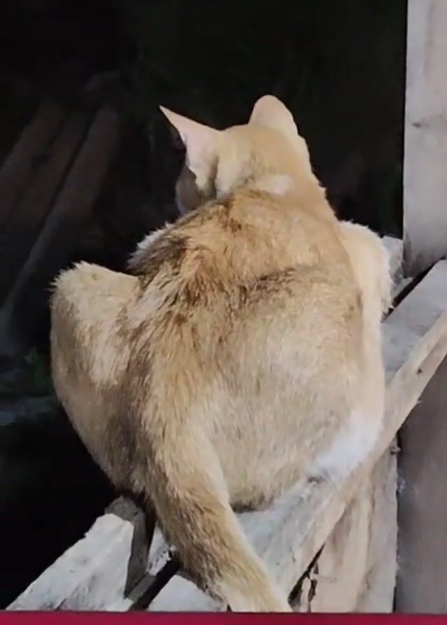 An orange and white cat sits on a wooden structure at night. The cat is facing away from the camera. There is a dark, blurred background, possibly including trees and another building.