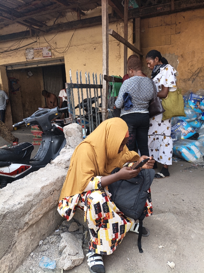 The scene depicts an outdoor urban environment in Fagge C, Nigeria, with multiple individuals present. In the foreground, a female wearing a mustard-yellow head covering and a multicolored patterned dress is seated on a low concrete barrier, actively engaged with a black smartphone held in both hands. A dark backpack is positioned next to her. Behind her and to the right, two adult females stand, facing away from the viewer. The left woman wears a black and white patterned top and dark trousers; the right woman wears a white floral-patterned dress, carries a dark brown shoulder bag, and an olive-green fabric bag. Stacked clear plastic bags of "KISSKI BABY PANTS" diapers are visible on the ground to their right. In the mid-ground, a black scooter is parked to the left of the standing women, near the concrete barrier. Behind the scooter, red boxes are stacked. A dark metal gate structure is situated between the scooter and the standing women. The background features a faded yellow-painted building with an open doorway. Inside this doorway, two male figures are partially visible; one is bending forward, and the other is standing to the left. Overhead, exposed wooden beams and electrical wiring are present. A faded sign with text including "Iriri Sai Garu" is affixed above the doorway. The ground surface is composed of dirt and scattered debris, including small rocks and discarded plastic.