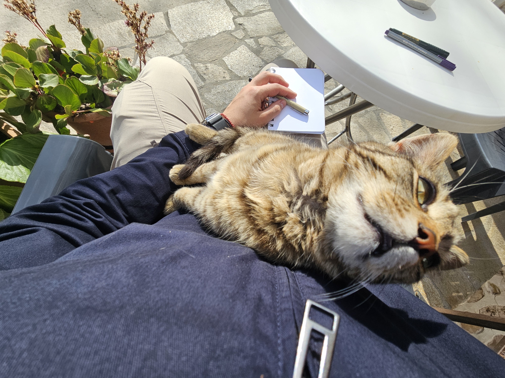 The scene depicts an outdoor patio or terrace in Melnik, Bulgaria, under direct sunlight. A brown and tan tabby cat is positioned on its back, resting across the lap of an individual. The cat's head is inverted towards the camera, displaying yellow-green eyes and pink nostrils. The individual is wearing a dark blue long-sleeved garment on their upper lap and light tan trousers on their lower leg. Their left hand, visible on the right, wears a dark watch with a red bracelet and holds a small, white, spiral-bound notepad and a light-colored pen. A white round table is partially visible to the right, with two markers (one purple, one dark green/black) resting on its surface. The ground is paved with irregular, light-colored stone tiles. In the background, a potted plant with large green leaves and dried flower stalks is visible, indicating vegetation.
