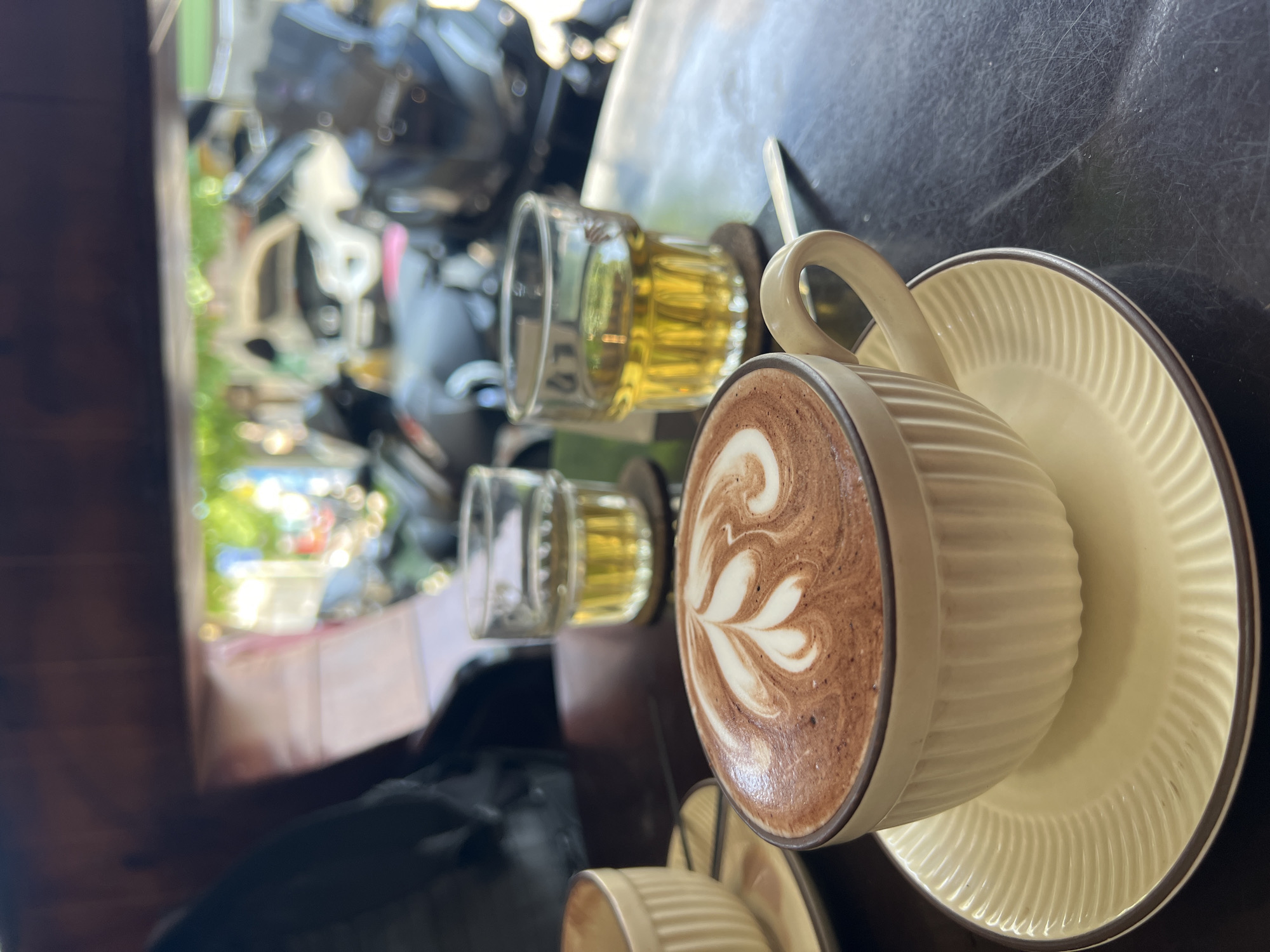 cappuccino in a ribbed cream-colored cup with latte art, sitting on a matching saucer, on a dark-colored table. Two small glasses of yellowish liquid, possibly tea, are positioned behind the cup. The background is blurry, but suggests an outdoor setting with a glimpse of foliage and other objects, possibly including vehicles. The location of Nam Nha Trang, Vietnam is provided as a detail for the scene.