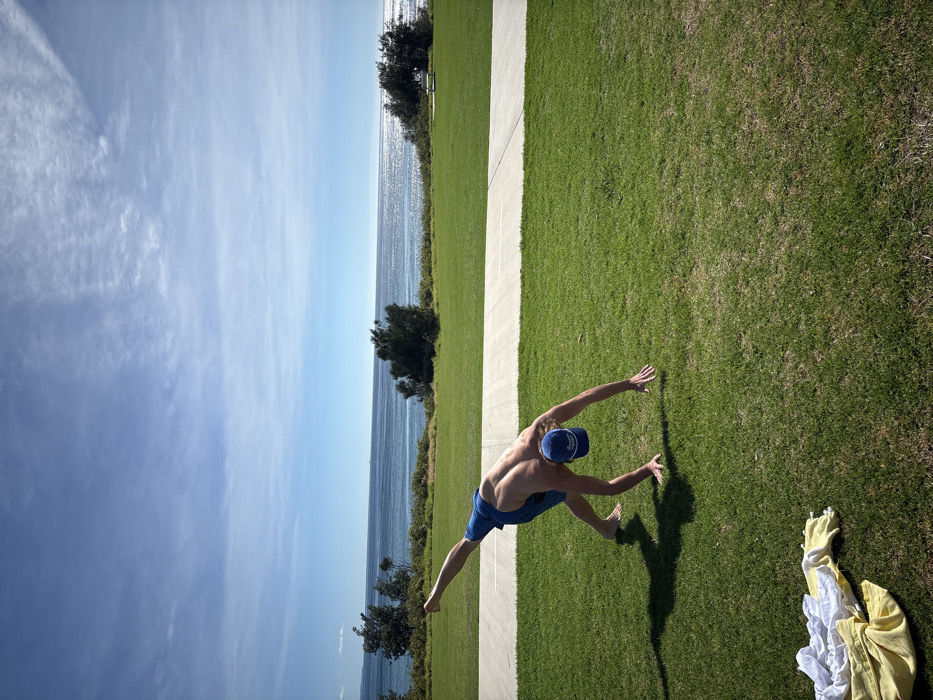 A man in blue shorts and a baseball cap practices yoga on a grassy lawn beside a white path. The ocean and a blue sky filled with clouds are visible in the background, with trees separating the grass from the water. A pile of white and yellow clothing rests on the grass.