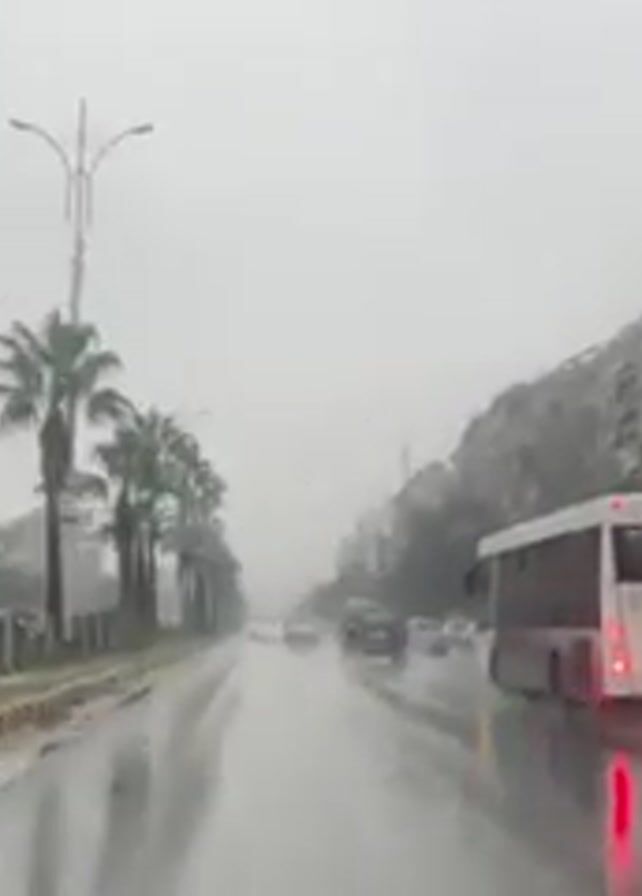 rainy street scene from inside a vehicle. The windshield wipers are active. A white bus is in front of the vehicle, and other cars are visible further ahead on the wet road. Palm trees line the street on the left, and buildings are visible on both sides. The sky is overcast. The road is wet and reflects the lights of the vehicles.