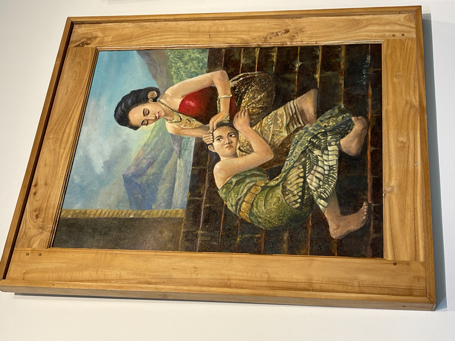 A vertical oil painting, enclosed in a natural light-wood frame with visible grain, hangs on a plain white wall. The painting depicts two Indonesian women on a series of dark-brown steps in an outdoor setting. The upper woman is seated, facing left, wearing a red off-shoulder top, a gold patterned sarong, and elaborate gold jewelry including a necklace and earrings. Her dark hair is styled with a flower. She gazes downwards, her right hand gently placed on the head of the lower woman. The lower woman is positioned on a step below, reclining with her head resting on the upper woman's lap. She wears a green-and-gold patterned sarong. Her eyes are open, looking slightly upwards. Her left arm is bent with her hand near her face. In the background, behind a low wall or balustrade, a vast blue body of water is visible, flanked by lush green mountains under a bright blue sky with white clouds. The lower right corner of the painting contains the signature "S. Wijaya 2022". The landscape depicted is consistent with the mountainous and lakeside natural environments found in the region surrounding Bogor, Indonesia.