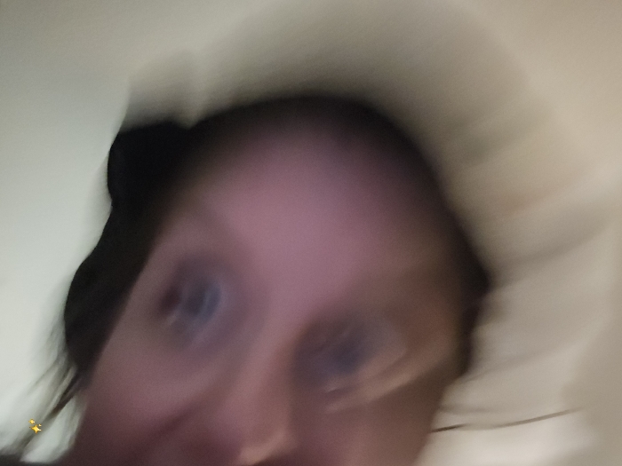 The image displays a severely motion-blurred close-up of a human face, oriented diagonally, predominantly dark-haired, and appearing to have a medium to dark complexion with areas of reddish-purple discoloration due to the blur. Two indistinct, somewhat bluish-tinted oval shapes consistent with eyes are visible on the upper-left portion of the face. The surrounding environment consists of heavily blurred, light-colored material, possibly fabric or a wall, creating an enclosed or tunnel-like effect around the subject. No specific actions or interactions are discernible due to the extreme lack of clarity. A small, yellow-white "sparkle" graphic overlays the lower right corner of the image. The image contains no discernible geographic markers, landmarks, or contextual elements to identify a specific location within the city of Lompoc, United States.