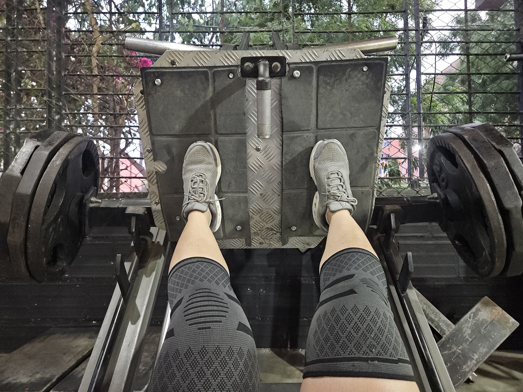 A first-person, downward-angle photograph captures the lower extremities of an individual engaged with a leg press machine in Perímetro Urbano Cúcuta, Colombia. The subject's bare lower legs are visible, terminating in grey athletic shoes with white soles. Each knee is covered by a grey, patterned compression sleeve. Both feet are positioned firmly on the textured, dark grey metal footplate of the leg press machine, which features a central silver-colored handle or release mechanism. On either side of the machine's frame, several dark, circular weight plates are loaded onto horizontal posts. Beyond the exercise equipment, a dark metal mesh fence is visible, behind which dense green foliage and trees are present, interspersed with a few pink flowers on the left side. In the background, indistinct reddish-brown structures are partially visible through the vegetation and fence. The scene depicts an individual utilizing gym equipment in an outdoor or semi-outdoor environment.