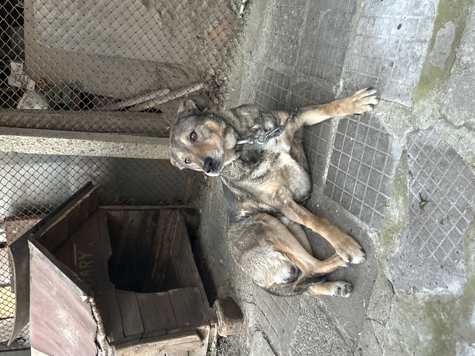 A medium-sized, brindle and tan mixed-breed dog lies on a concrete tiled surface in an outdoor enclosure in Bukovlak, Bulgaria