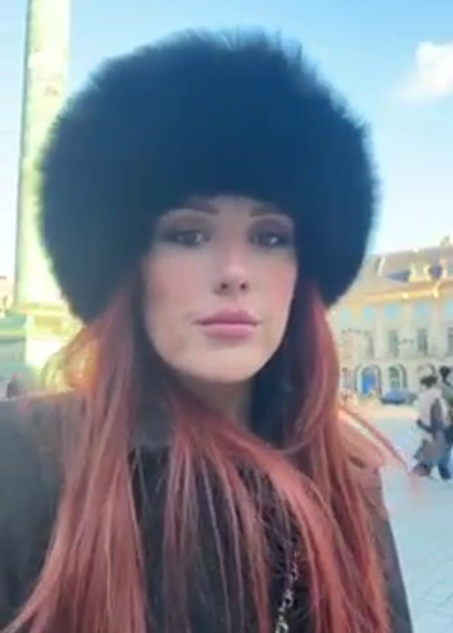 A woman with long red hair and a large black fur hat poses for a selfie. She is standing in a city square with a column monument and a large building in the background. Other people are walking around in the background. The sky is blue with some clouds. She makes a kissing face at the camera.