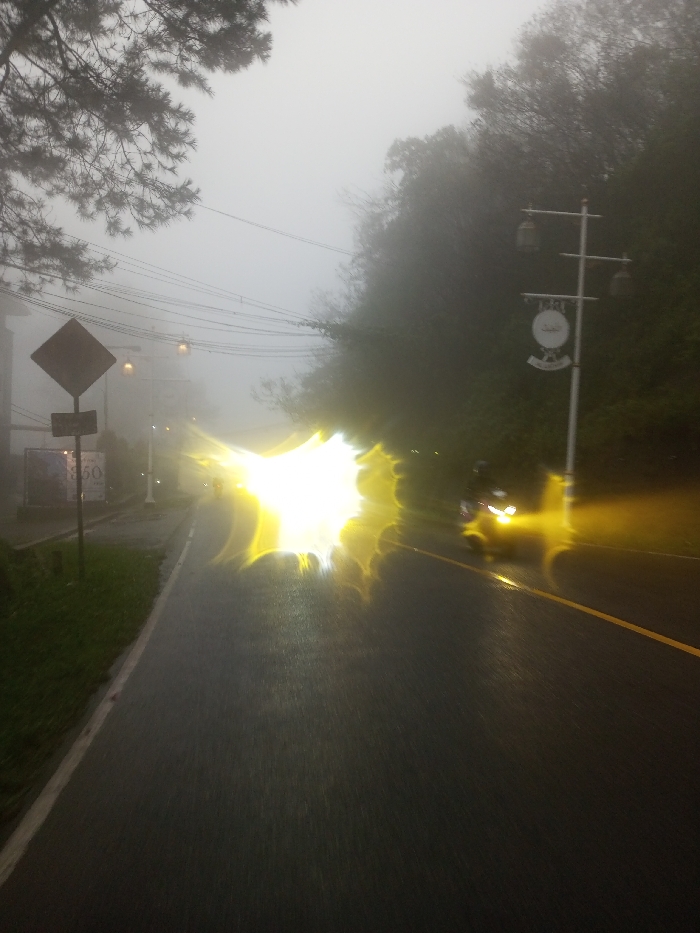 The scene depicts a foggy, wet asphalt road in Dawathang_Dorjibi_Kashingtsawa, Bhutan