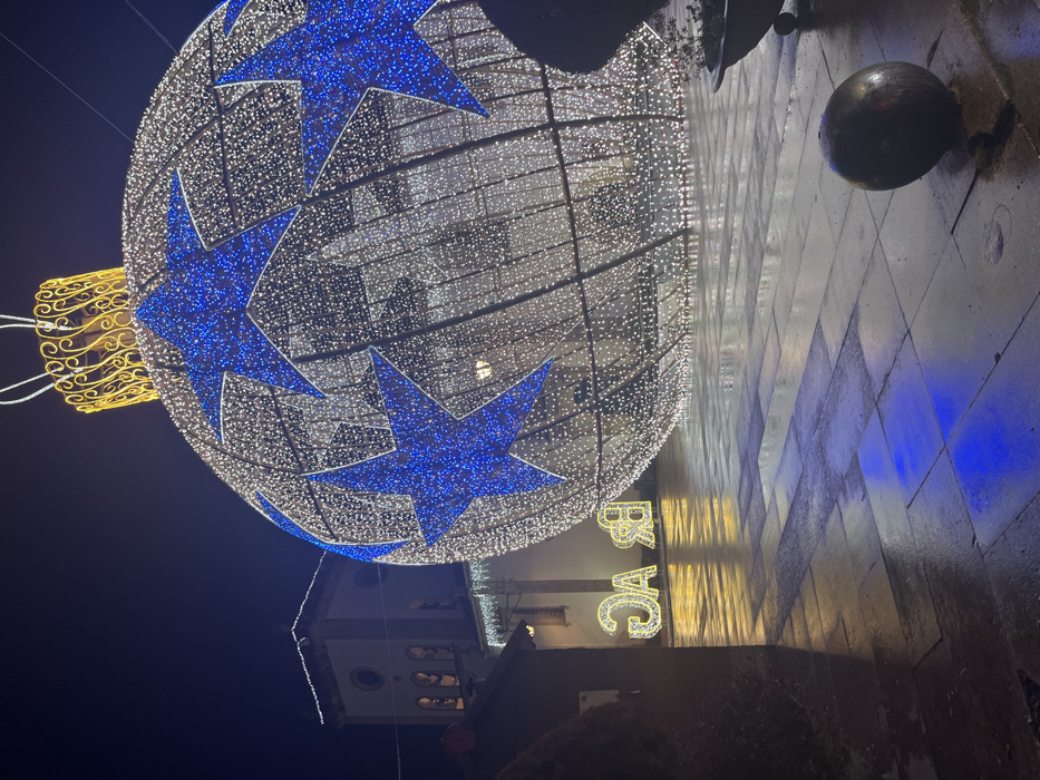 - "A large Christmas ornament hangs, adorned with white and blue lights shaped like stars" by FM-IiCPk1, licensed under CC BY 4.0