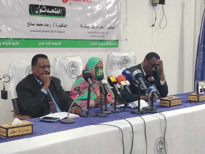This image depicts an indoor press conference or official meeting taking place in the Police Hall, Port Sudan, Sudan, on Thursday, September 18, 2025, at 1:00 PM