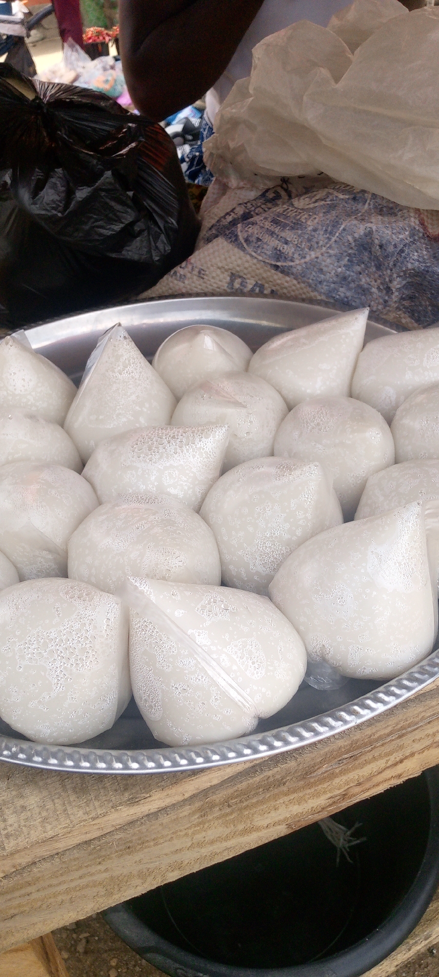 The image depicts a close-up of a silver tray filled with multiple portions of a white, semi-solid food item, individually wrapped in clear plastic. These portions appear to be spheres or teardrop shapes. The tray rests on a rough wooden surface, near a black bucket. In the background, there are indistinct shapes and colors of what could be other items for sale, and at least one person in the frame. The location of the scene may be Zango-ndaji, Nigeria. The lighting in the photograph is bright and diffused.