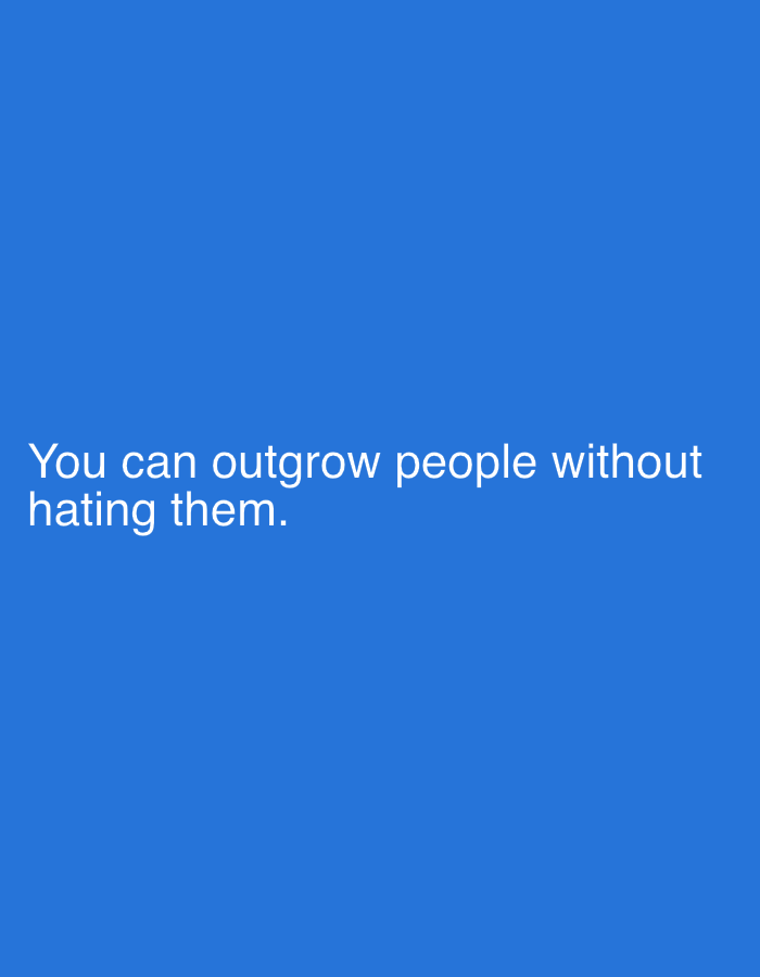 The image displays white sans-serif text centered on a solid, vibrant blue background. The text reads: "You can outgrow people without hating them." There are no people, physical subjects, objects, actions, or interactions depicted. The environment is an abstract blue field, and there is no discernible location within the city of Nesebar, Bulgaria, or any physical geographic location.