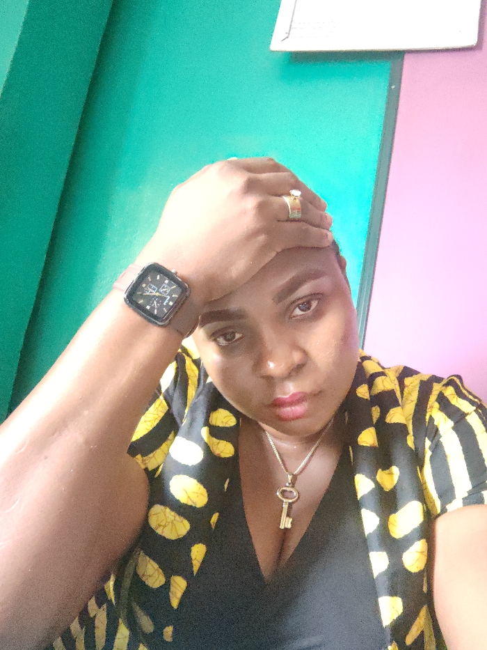 The image displays a head and torso shot of an adult female in an indoor setting. The individual, with dark skin, is looking directly towards the camera with a neutral expression. She is wearing a black v-neck top layered with an open, short-sleeved garment featuring a black background with irregular yellow patterns. A thin, metallic chain necklace with a key-shaped pendant hangs around her neck. On her right wrist, she wears a square-faced wristwatch with a dark strap, and a wide gold-colored ring with a prominent light-colored stone is present on her right ring finger. Her right hand is positioned against her forehead. The background consists of two distinct, vertically divided, solid-colored walls: teal on the left and pink on the right. A white rectangular object is affixed to the upper right portion of the pink wall. The specific location within Agani, Nigeria, cannot be determined from the visual information provided.