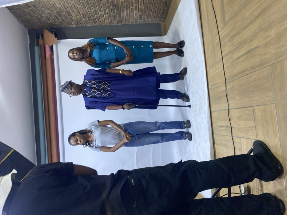 Three people are standing on a white backdrop, ready for a photo shoot. At the top, a woman wears a teal dress and black shoes. Below her, a man in a blue traditional outfit holds a cane. At the bottom, a woman is wearing a gray shirt and jeans. The photographer, wearing black pants and shoes, is in the foreground, partially obscuring the view. The background includes a brick wall, rolls of colored paper, and a wood floor.