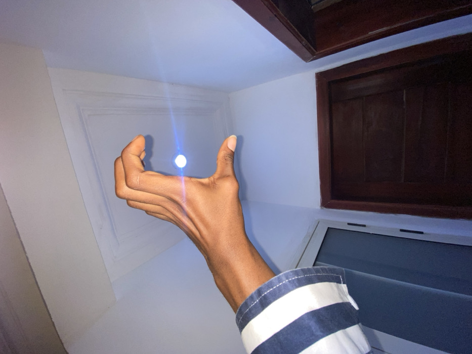A hand with dark skin holds a glowing orb between the thumb and fingers, against a background of light blue walls. There's a window to the left, and a dark brown wooden structure, likely a cabinet or shelf, on the right. The lower right corner shows a white surface, possibly a counter or appliance, with a dark grey object on it. The person's wrist is visible, clad in a blue and white striped shirt sleeve.