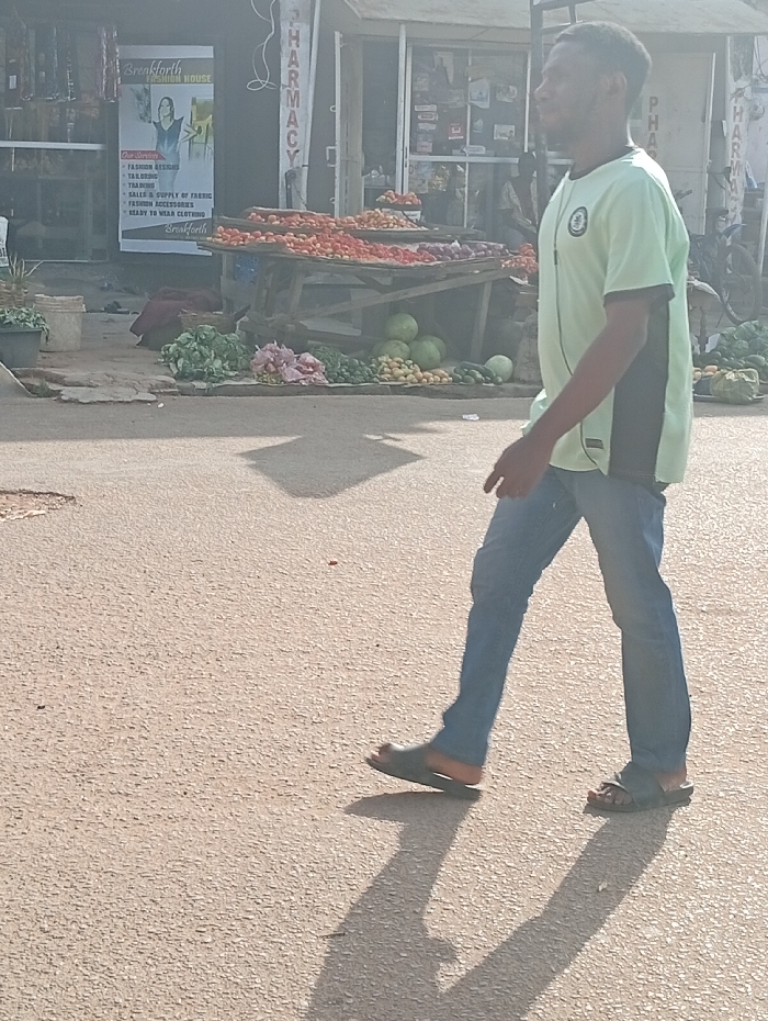 An adult male walks left-to-right across a paved street in Jebbu Miango, Nigeria