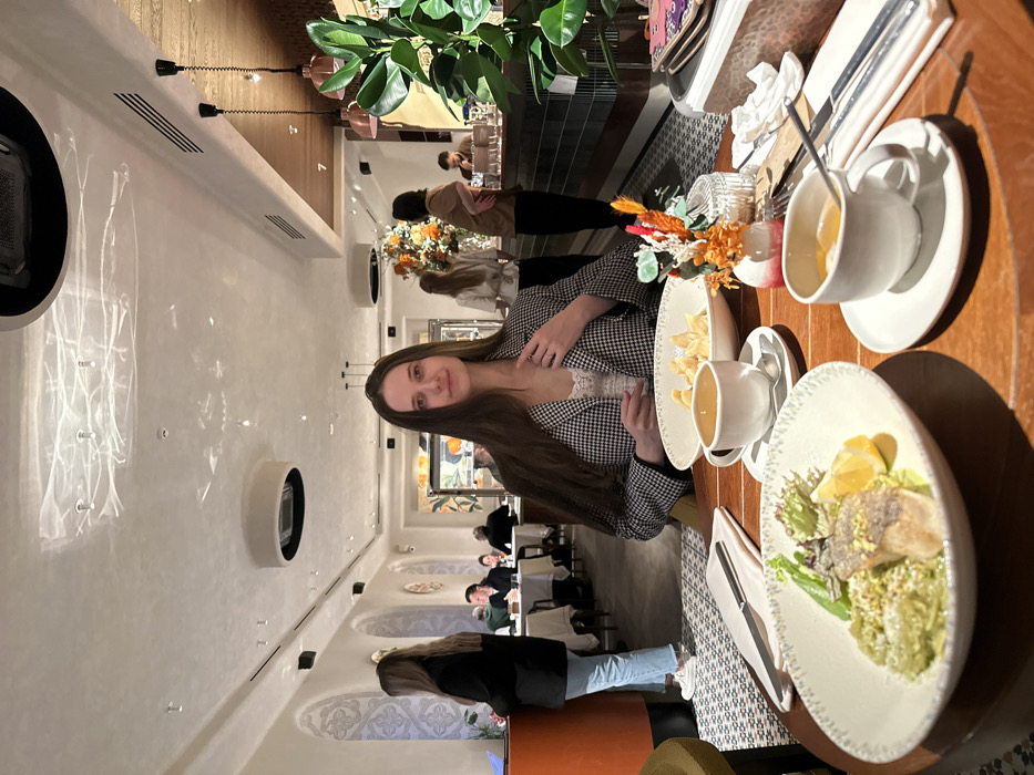 An interior shot depicts the SAVVA restaurant located at Teatralny Proezd, 2, Moscow, Russia, within the Metropol Hotel. A young adult female, with long dark hair and wearing a black-and-white checkered blazer over a white lace top, is seated at a round wooden table in the foreground, looking directly at the camera. On the table in front of her are two white ceramic plates: one oval plate contains a piece of pan-seared fish over a green puree, garnished with a lemon wedge and a small salad, sprinkled with nuts; the other, a large bowl, holds several dumplings or pelmeni. Two white cups with saucers, one containing a beverage and a spoon, are also present. A small vase with dried orange, red, and white decorative elements sits between the dishes. A knife and fork rest on a folded white napkin. The restaurant's interior features light-colored walls with decorative arched recesses displaying intricate patterns on the left. The white ceiling contains recessed spotlights and distinct wave-like light reflections. Circular ventilation or light fixtures are visible overhead. In the background, numerous other patrons are seated at tables with white tablecloths, dining and interacting. To the right, a bar or service counter with a dark, possibly tiled, front is visible, occupied by several individuals. A large potted plant with green leaves stands to the right, and a large decorative arrangement with orange and yellow elements is visible in the mid-ground. The scene is well-lit, suggesting an evening or late afternoon setting.