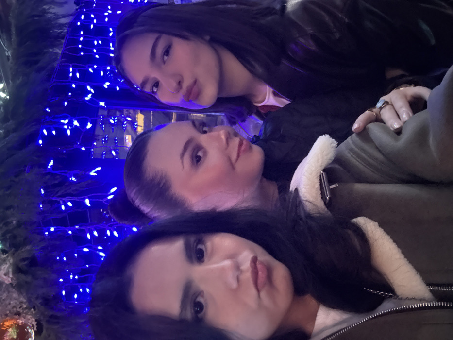 Three young women are captured in a selfie-style image. They are posed closely together, with one above the other. The background features blue and white holiday lights, adding a festive atmosphere. Each woman has dark hair and appears to be making a slight kissing face towards the camera. The clothing suggests cold weather, with at least one wearing a jacket with a sherpa collar. They are wearing light makeup and jewelry.