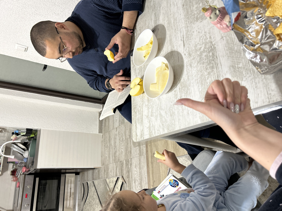 The scene depicts an indoor residential setting in Zlatograd, Bulgaria. A man, approximately in his 30s with short hair, a beard, and glasses, is seated at a light-colored table on the right. He wears a dark blue, textured long-sleeved shirt and dark trousers. His left hand holds an open book, while his right hand holds a piece of yellow apple, which he appears to be eating. A watch is visible on his left wrist, and red and black bracelets are on his right wrist. To his left, a young child, partially visible, is also seated at the table. The child, wearing light blue pajamas with white snowflake patterns, holds a piece of yellow apple in their right hand. A book or magazine with "ZOO TOHO" visible in Cyrillic is open in front of the child. On the table, there are two halves of a yellow apple, and two white, oval-shaped bowls containing peeled, sliced yellow apple pieces. Further right on the table, a crumpled silver foil bag, likely containing yellow tortilla chips, is present. A small decorative white polar bear figure wearing a pink hat and scarf is clipped to the edge of this bag. In the immediate foreground, a hand, likely belonging to a third individual, is raised in a "thumbs-up" gesture. This hand has long, light-colored manicured nails, with the ring finger featuring glitter or rhinestone embellishment. The person's dark clothing with a pink trim is partially visible. The background to the left of the man reveals a kitchen area with light-colored tiled flooring. A stainless steel oven and stovetop unit is visible, along with white kitchen cabinets. Above the counter, a sink with a faucet and a dish drying rack containing various dishes and bottles are present. Behind the man, a dark-framed door or window is visible against a plain white wall, which also features a white light switch. The room is illuminated by artificial indoor lighting.
