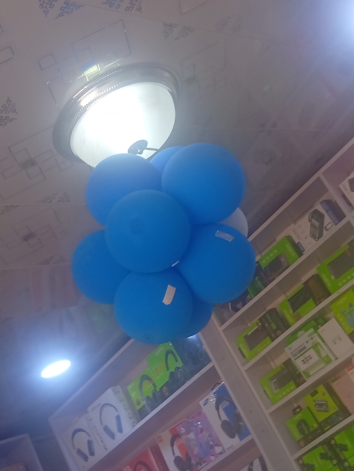 The image depicts an indoor commercial retail space in Jos, Nigeria, likely an electronics or accessories store. The perspective is an upward angle towards the ceiling. A white, patterned ceiling features a prominently lit circular flush-mount light fixture in the upper center and a smaller circular spotlight in the upper-left. A cluster of approximately eight to ten blue balloons, with at least one partially visible white balloon, hangs suspended from the ceiling, positioned below the main light fixture. Several balloons have small, light-colored rectangular adhesive strips attached. White shelving units are visible in the background, lining the walls, and are stocked with numerous boxed products. The shelves on the right primarily display items in green packaging, consistent with electronics or accessories. The shelves on the lower-left also contain boxed items, including headphones in white and red packaging. No individuals are present in the frame, and no specific actions or interactions are depicted. The precise location within Jos, Nigeria, beyond being an indoor commercial establishment, is not discernible from the visual evidence.