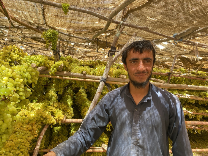 A male individual is depicted standing within a grape drying or storage facility in Bazar-e Panjva'i, Afghanistan