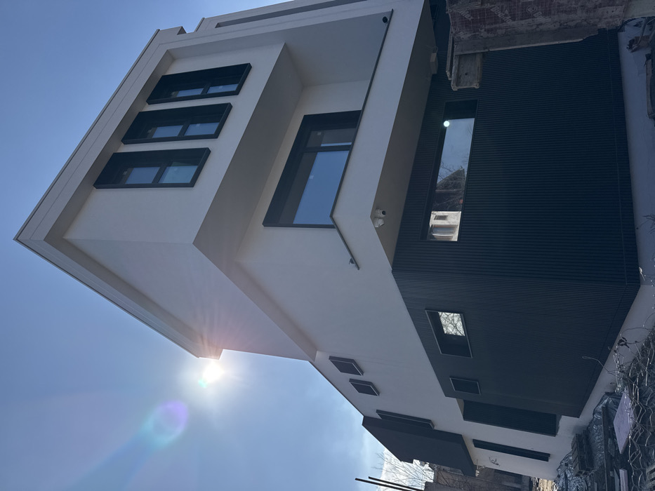 The image depicts a modern, multi-story building with a distinctive architectural style under a clear, bright blue sky in Sofia, Bulgaria. The sun, positioned in the upper left, casts a strong glare and lens flare. The building features predominantly white, smooth-rendered upper facades contrasted with a dark gray or black vertical slat cladding on the lower sections. The structure presents a tiered, geometric form. The uppermost visible floor has three vertical rectangular windows with dark frames, flanked by what appear to be dark, fixed exterior shutters or panels. Below this, a large horizontal rectangular window with a dark frame is situated above a white balcony ledge. Two white security cameras are mounted underneath this ledge. The ground floor section, clad in dark vertical slats, includes multiple rectangular windows of varying sizes, which reflect bare tree branches and portions of adjacent structures. The immediate surroundings indicate a construction or unlandscaped area. Visible on the ground are bundles of metal rebar, scattered pieces of pink and white insulation, and general debris, suggesting ongoing work or a recently completed phase. No individuals or active interactions are present in the scene.