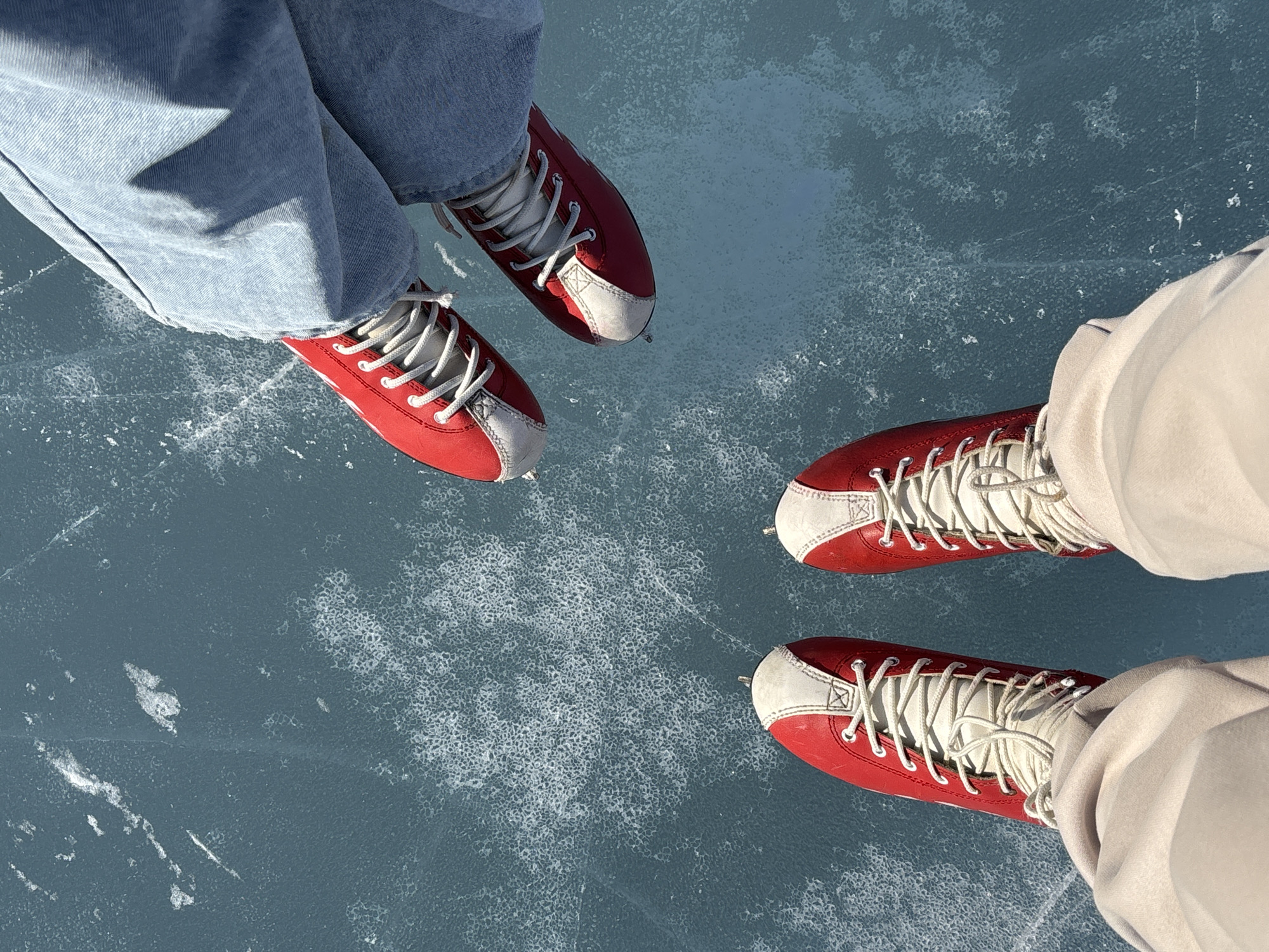 Two individuals are depicted from an overhead perspective, standing on a frozen body of water identified as Lake Baikal in Listvyanka, Russia. The upper subject wears light blue denim trousers and red ice skates with white toe sections and white laces. The lower subject wears light beige trousers and an identical pair of red ice skates, also featuring white toe sections and white laces. Both pairs of skates are equipped with visible blades resting on the ice. The ice surface is a deep blue-green, characterized by numerous scattered white, irregular patterns, consistent with trapped air bubbles or surface frost. Subtle linear abrasions, indicative of previous skating activity, are visible. The scene is illuminated by direct sunlight.