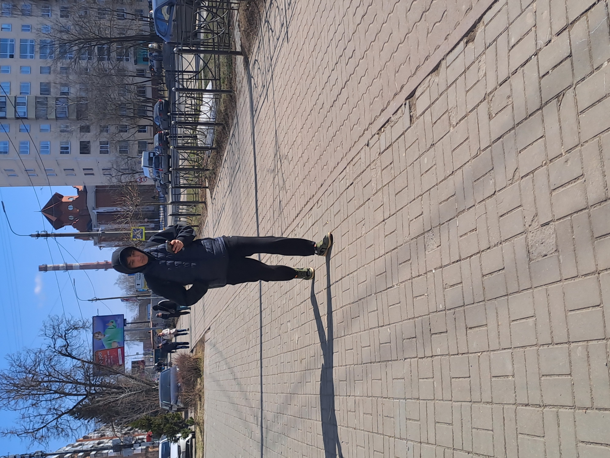 The scene depicts a young adult male walking on a grey paver sidewalk under a clear blue sky in Меткомелино, Russia. He is wearing a dark hooded puffer jacket, dark pants, and green sneakers, looking down at a smartphone held in his right hand; his left hand is in his pocket. A long shadow is cast to his left. To the immediate right of the sidewalk, a black metal fence separates it from a road where several vehicles, including cars and vans, are parked or in motion. Patches of dirty snow are visible near the fence. Further right, a multi-story, light-colored residential building stands prominently, behind which a distinct red-brick building with a reddish-brown turreted roof and round windows is visible. In the mid-ground to the left, several other pedestrians are walking on a similar sidewalk. A large billboard displaying an advertisement featuring a person in a green top holding a mobile phone is prominent. Bare trees and utility poles line the street. A tall, grey industrial smokestack is visible in the distant background on the left. Buildings of varying heights and styles are present on both sides of the street. The overall lighting suggests a bright, sunny day, likely in late winter or early spring given the bare trees and residual snow.