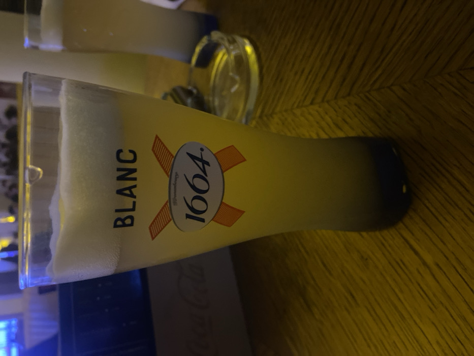 - "A glass of Blanc 1664 beer, recognizable by its iconic branding, sits on a wooden surface" by FM-1ntxd2, licensed under CC BY 4.0