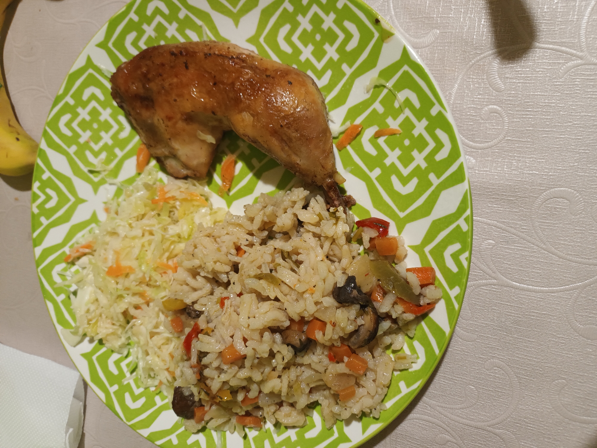 A meal on a green and white patterned plate is placed on a white textured surface. The meal consists of a roasted chicken leg, a pile of white rice mixed with vegetables including carrots, mushrooms, green peppers, and red peppers, and a salad of shredded cabbage with carrots. In the upper left corner of the image, a partially visible banana lies next to the plate. The location is unknown.