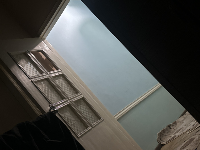 An angled view shows a door with six window panes, each covered with a wire mesh, slightly ajar. A dark curtain or clothing item is in the lower left corner. The door leads to a room with pale blue walls and a decorative white border along the top. Part of a bed or couch with a light-colored blanket is visible in the lower right corner. The right side of the frame is dark, obscuring the view further into the room.