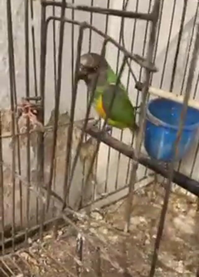 The camera is positioned outside a metal cage containing a parrot. The parrot is primarily green with gray plumage on its head, and yellow markings on its chest and neck. It is perched on a black bar inside the cage. A blue bucket, possibly for water or food, is attached to the inside of the cage. The cage appears old, with rust and a cluttered bottom. The background is a blurred, light-colored wall. The parrot appears to be looking around.